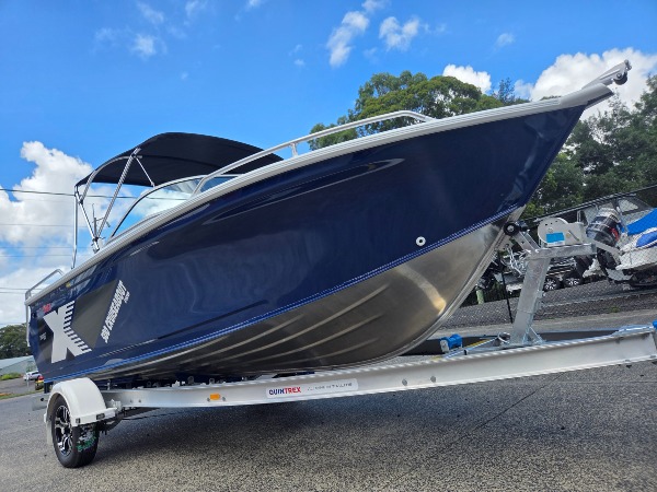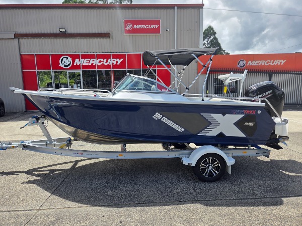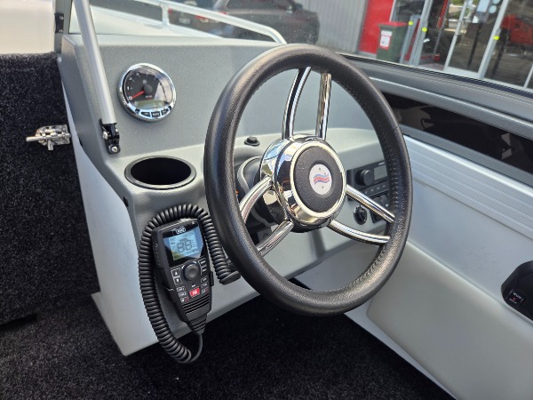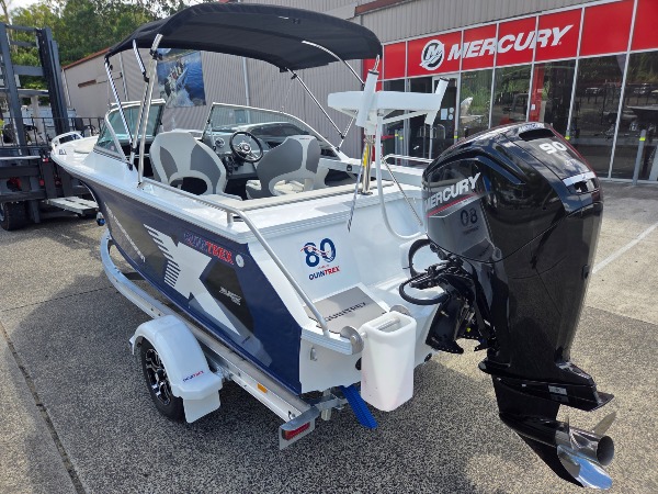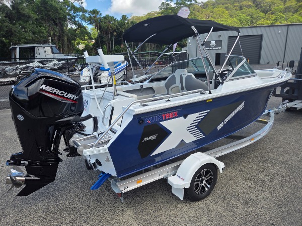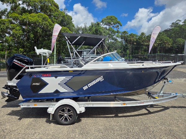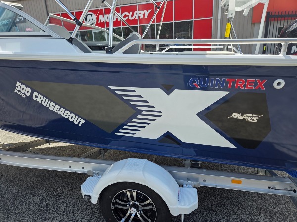 In stock and available now, 2026 Quintrex 500 Cruiseabout Pro powered by a Mercury 90hp Command Thrust 4-stroke. Boat Motor & trailer package includes all of the standard Pro features such as tilt hydraulic steering, VHF, Fusion stereo, bow cover, bow table, bunk infill & cushion, upholstered side pockets, ski pole + bait board combo and we have also optioned it with 2 tone paint and a transom door.