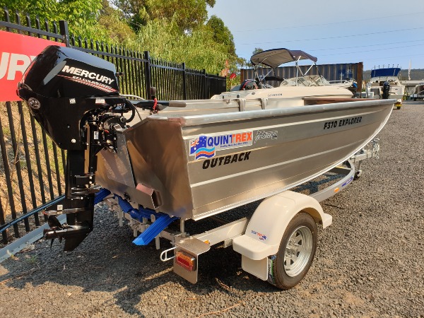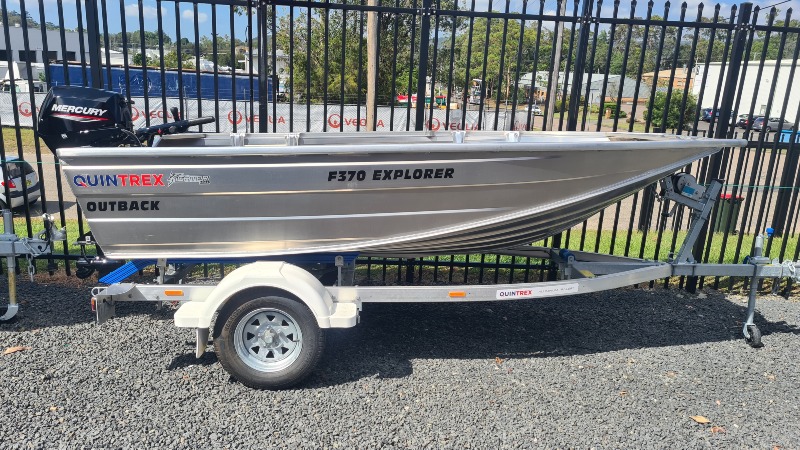 In stock and available 2026 Quintrex F370 Outback Explorer powered by a Mercury 4-stroke outboard. This boat also has a low floor, fuel tank rack and transducer bracket.
