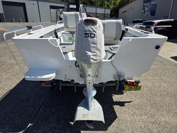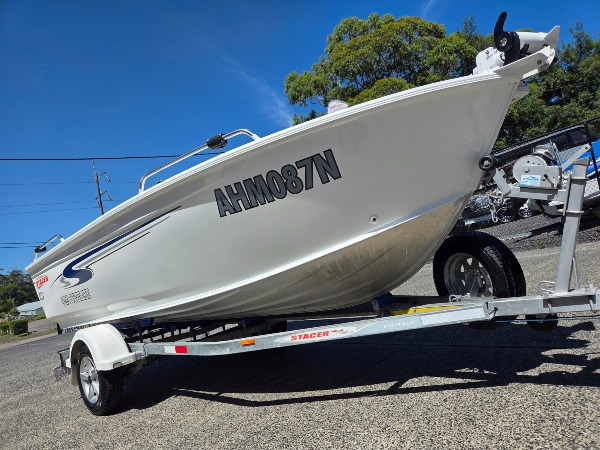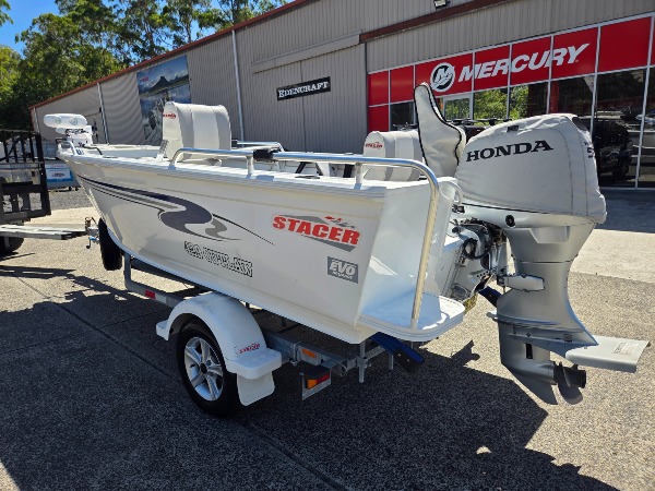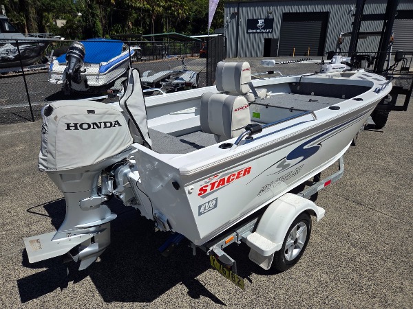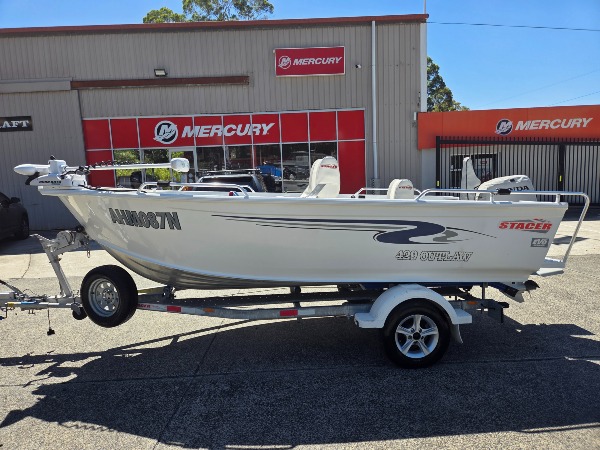 Just arrived 2014 Stacer 429 Outlaw tiller steer powered by a Honda 50hp 4-stroke electric start with tilt & trim. Sitting on a braked gal trailer with spare wheel & walkway, this boat has been meticulously maintained and also has a Minn Kota, Lowrance 4x fish finder, underfloor fuel tank, navigation lights, bilge pump, isolator switch & a boat storage cover.